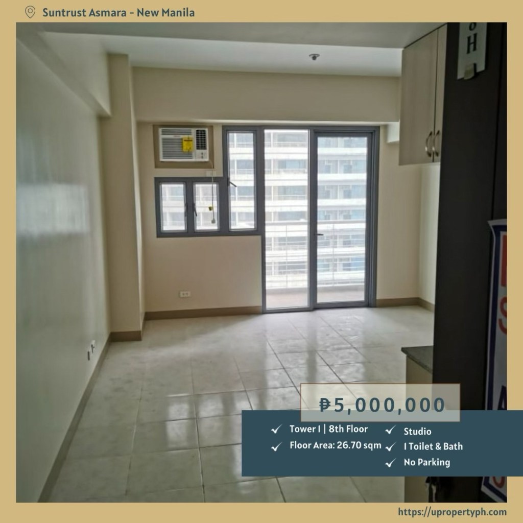 Looking for a smart and affordable condo in New Manila, Quezon City? This studio unit with balcony at Suntrust Asmara Tower 1 offers the perfect blend of convenience, comfort, and modern design. Located on the 8th floor, this 26.7 sqm unit is ideal for young professionals, students, and real estate investors seeking a strategic location near schools, hospitals, and transport hubs.