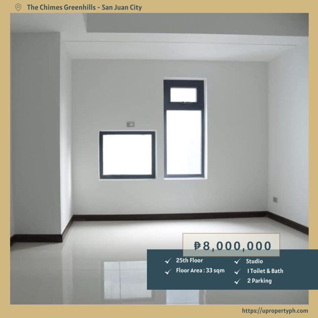 Unlock premium city living with this well-appointed 33 sqm studio unit for sale on the 25th floor of The Chimes Greenhills, a modern residential landmark in San Juan City. This unfurnished condo for sale in Greenhills offers a blank slate for personalized interiors—perfect for buyers seeking a custom-designed space.